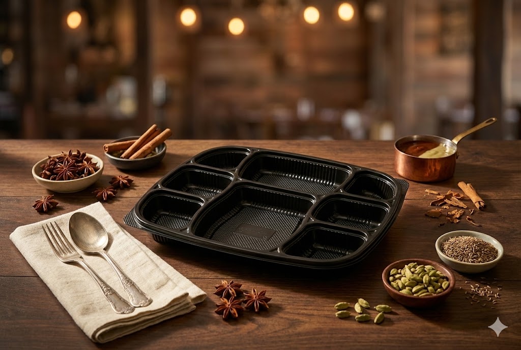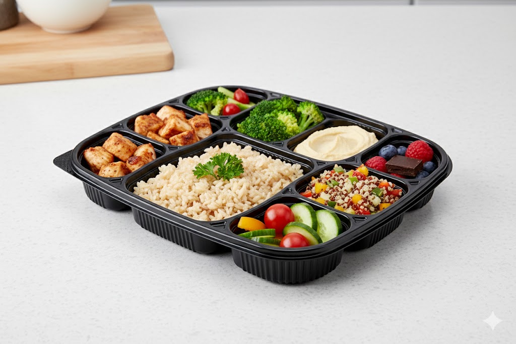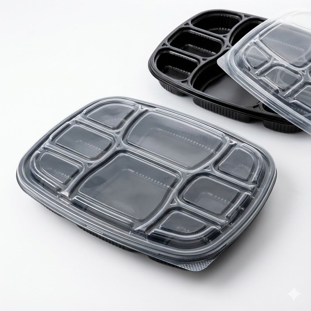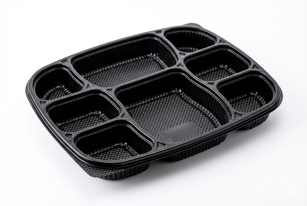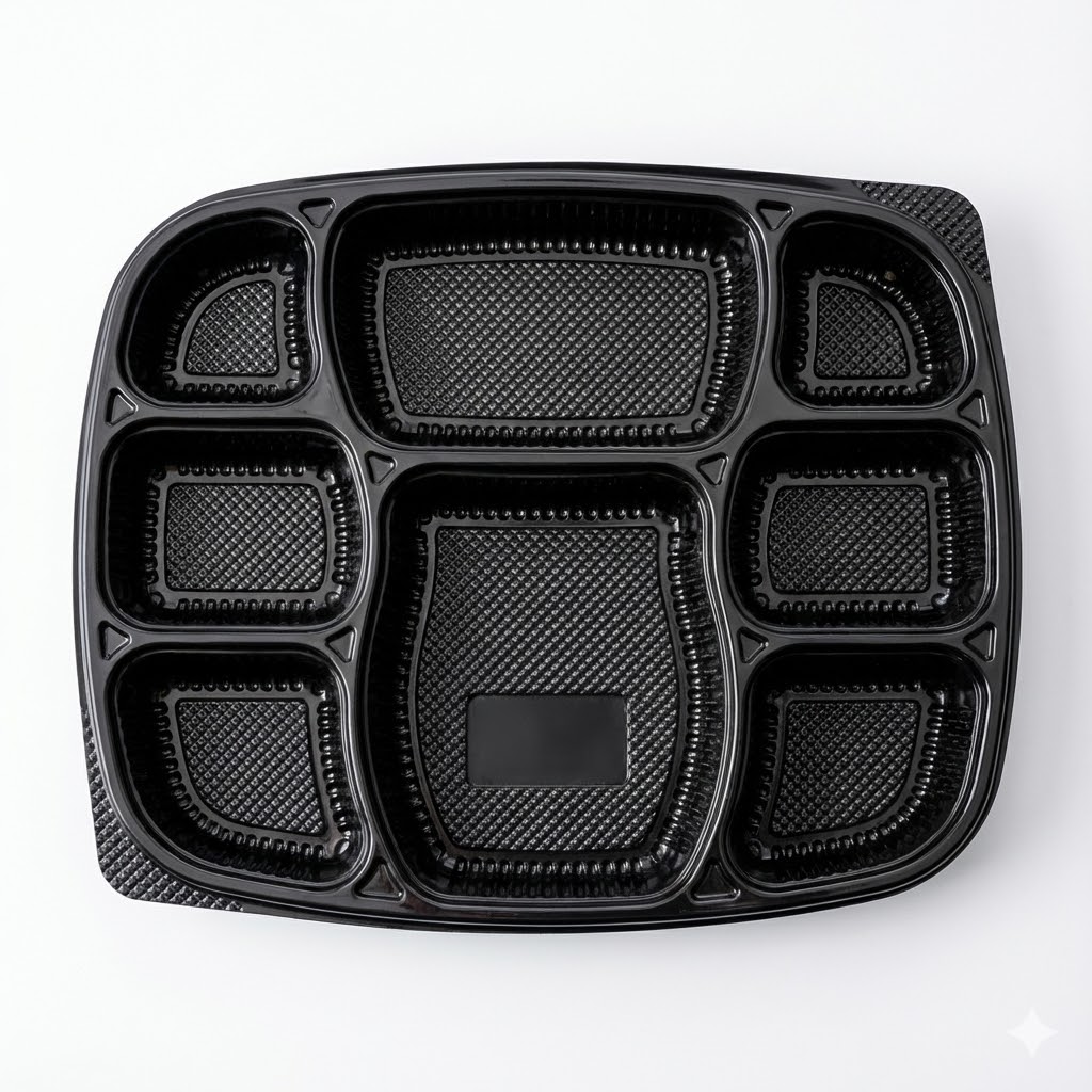 The 8-Compartment Black Meal Tray is a professional-grade multi-section food packaging solution designed for restaurants, takeaways, catering services, airlines, hotels, industrial canteens, hospitals, food exporters, and ready-meal manufacturers worldwide.