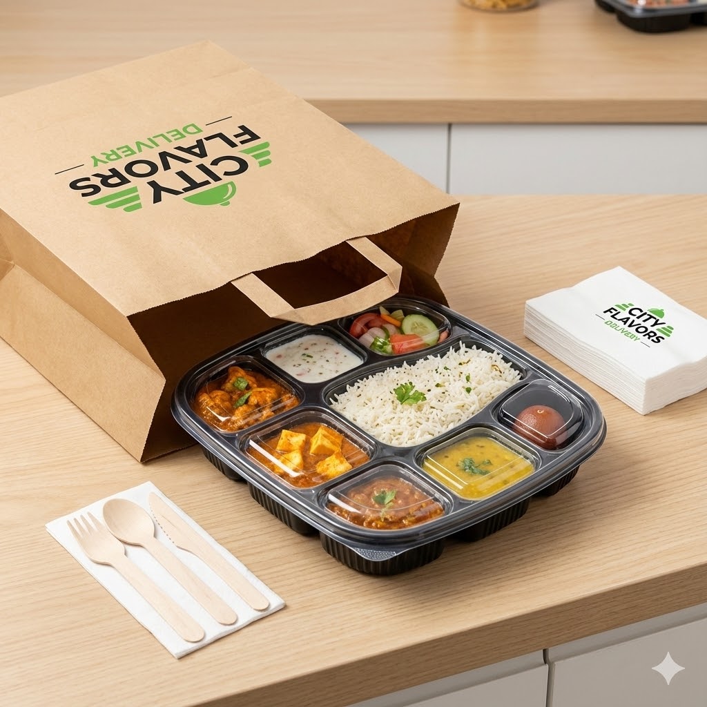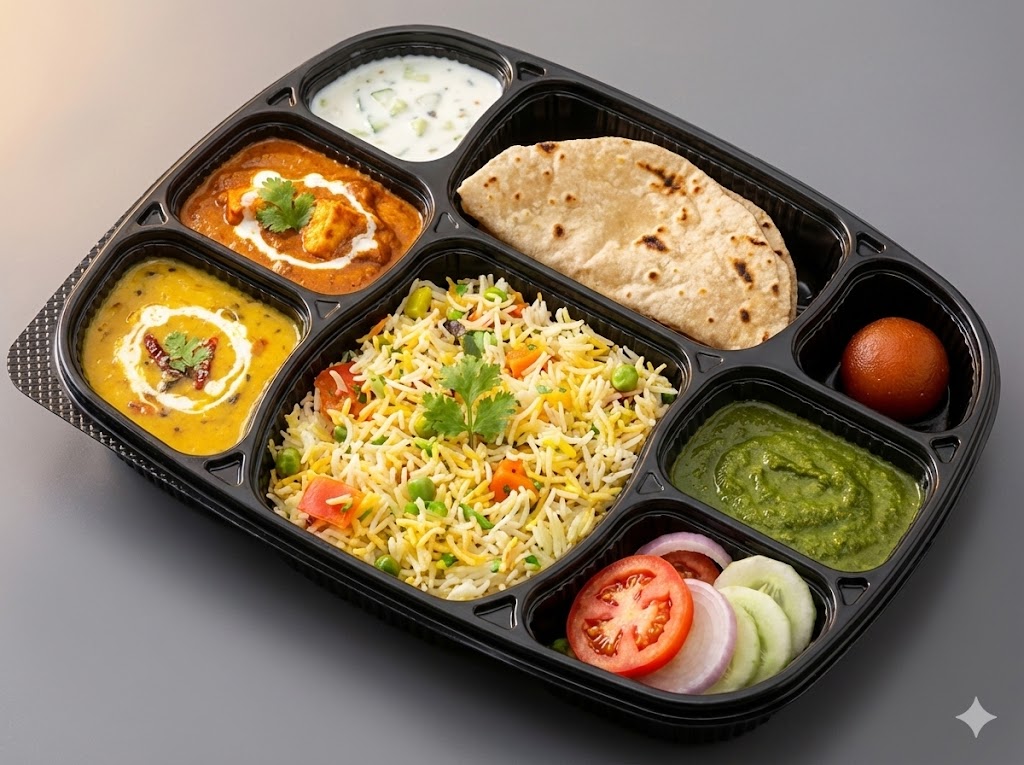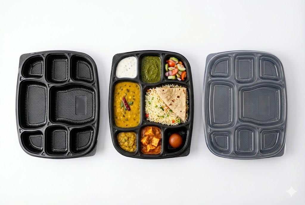Crafted from export-quality, BPA-free polypropylene, this tray offers 8 deep, well-structured compartments to keep different food items perfectly separated, fresh, and spill-free. It is engineered for hot meals, gravy-rich dishes, Indian thali, continental platters, meal prep, and international ready-to-eat meal packaging.